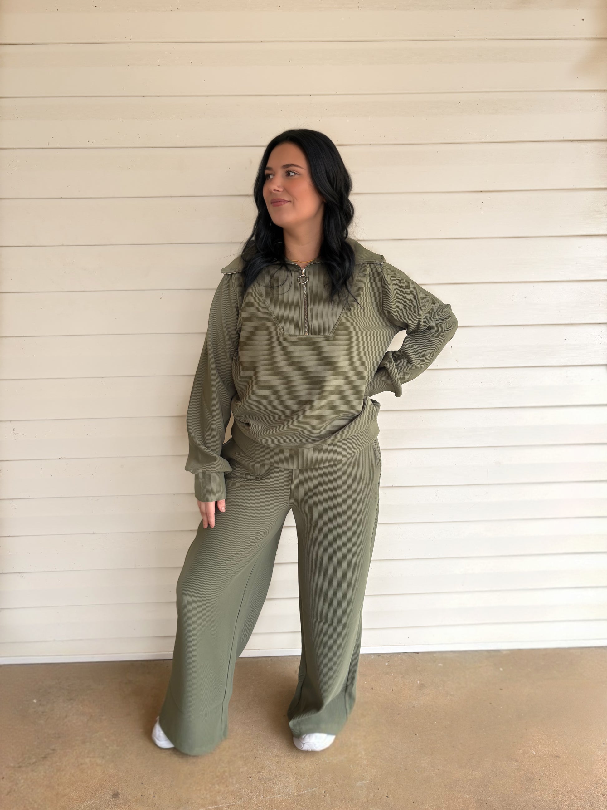 Jet Set, a cozy combo that'll show off your style! This ribbed high neck quarter zip pullover and pants are perfect for any fashion-forward girl.